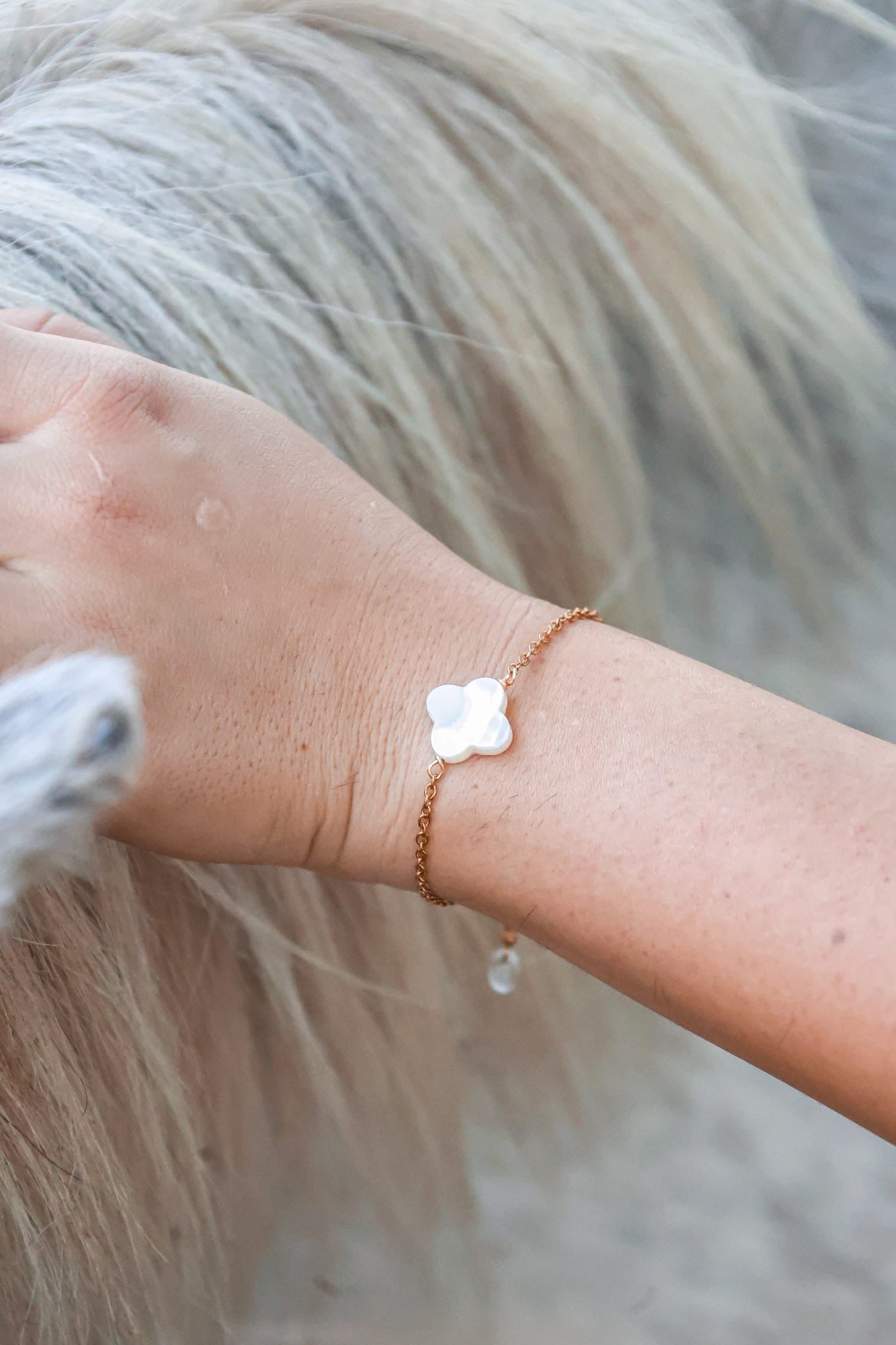 Bracelet délicat composé d’une fine chaîne en acier inoxydable (disponible en doré ou argenté), ornée d’un trèfle en nacre naturelle, tressé à la main avec du fil de cuivre anti-ternissement.