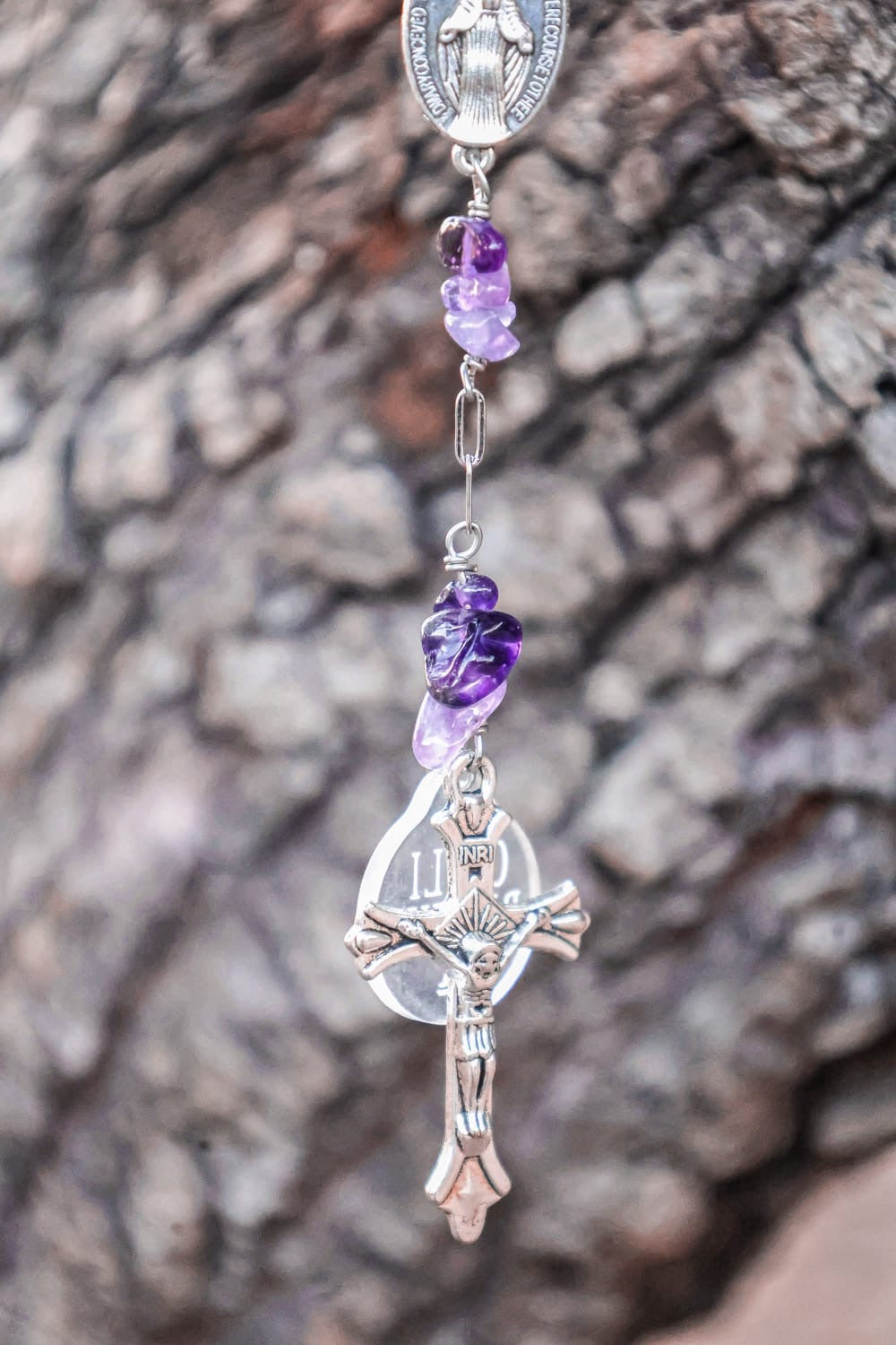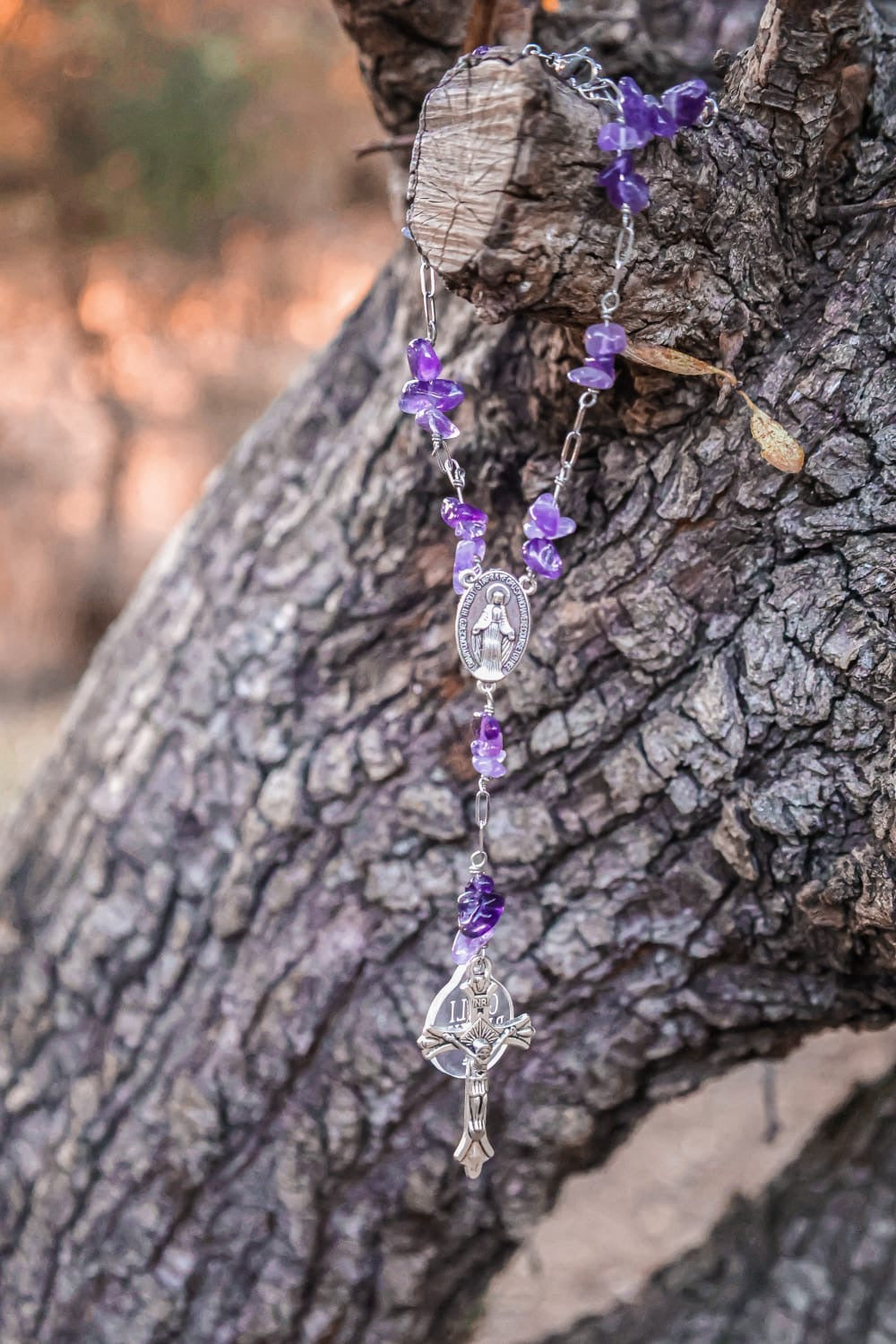 Chapelet artisanal tressé à la main, composé de perles d’améthyste enfilées avec un fil de cuivre anti-ternissement, et reliées par une chaîne en acier inoxydable argenté. Un talisman élégant et solide, pensé pour accompagner et protéger au quotidien. À accrocher dans la voiture, dans la maison ou à garder sur soi comme porte-bonheur.