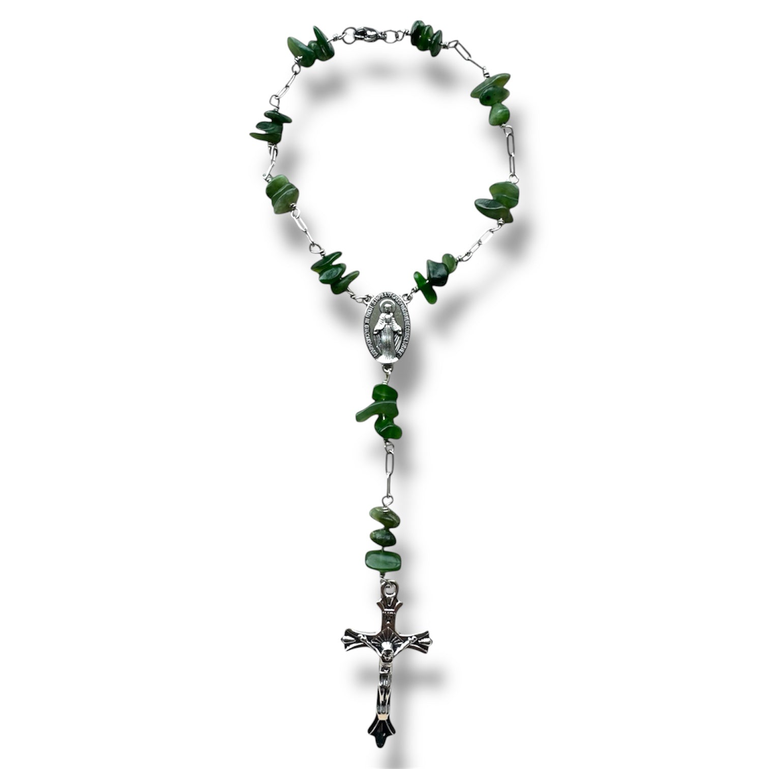 Chapelet artisanal tressé à la main, composé de perles de jade africain enfilées avec un fil de cuivre anti-ternissement, et reliées par une chaîne en acier inoxydable argenté. Un talisman élégant et solide, pensé pour accompagner et protéger au quotidien. À accrocher dans la voiture, dans la maison ou à garder sur soi comme porte-bonheur.