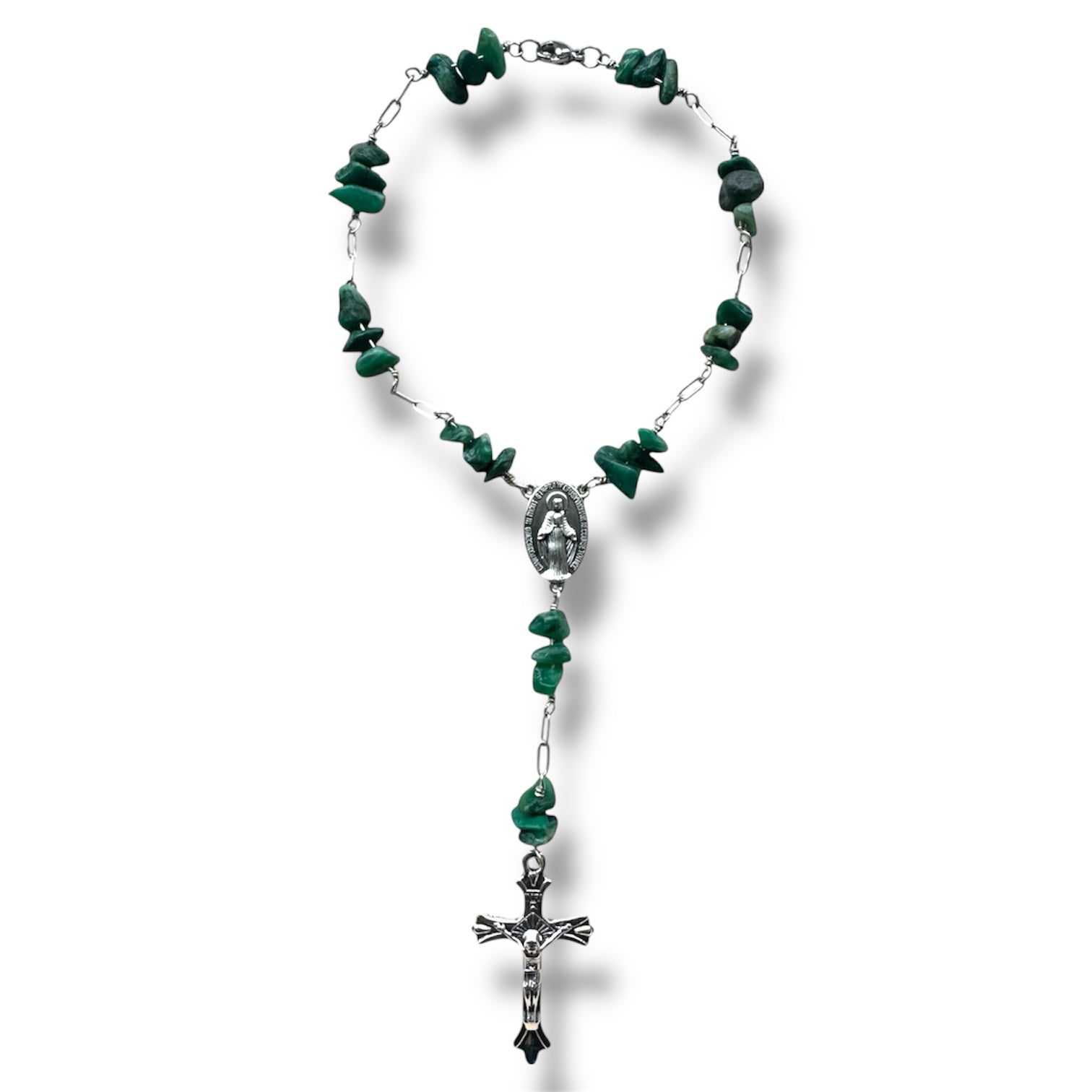 Chapelet artisanal tressé à la main, composé de perles d’opale verte enfilées avec un fil de cuivre anti-ternissement, et reliées par une chaîne en acier inoxydable argenté. Un talisman élégant et solide, pensé pour accompagner et protéger au quotidien. À accrocher dans la voiture, dans la maison ou à garder sur soi comme porte-bonheur.
