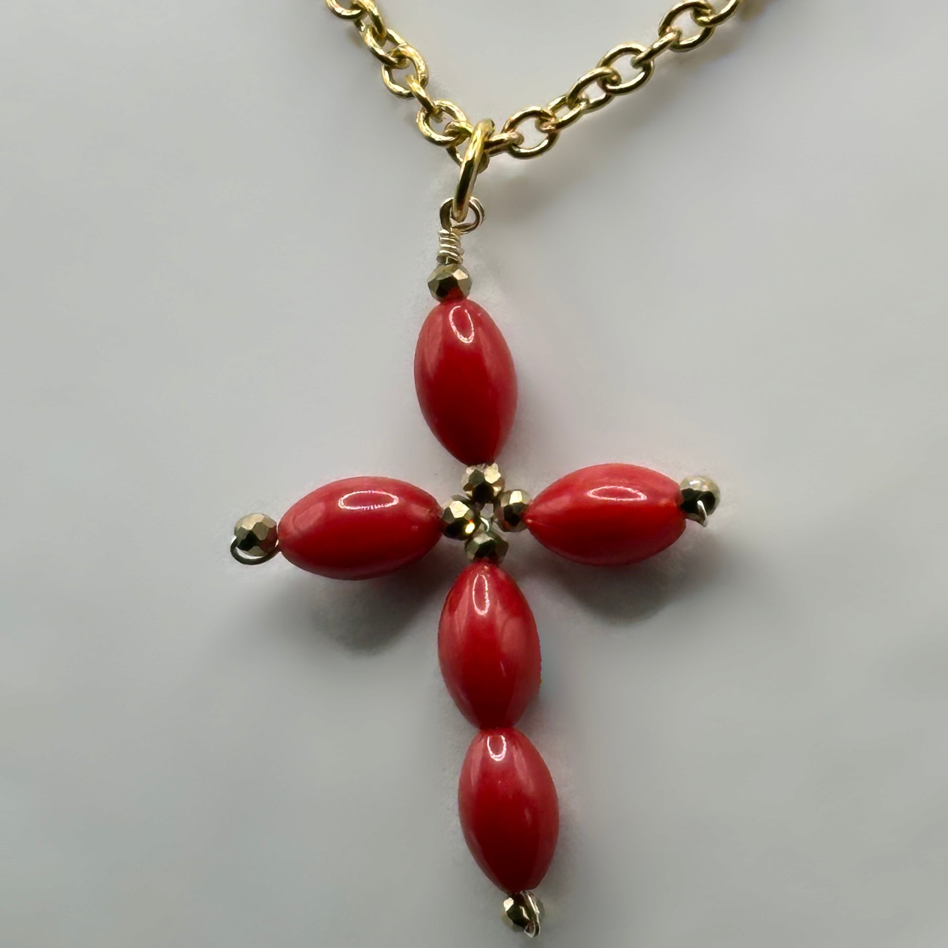 Au centre, une croix artisanale en corail bambou, façonnée et montée à la main avec du fil de cuivre anti-ternissement, vient sublimer l’ensemble.