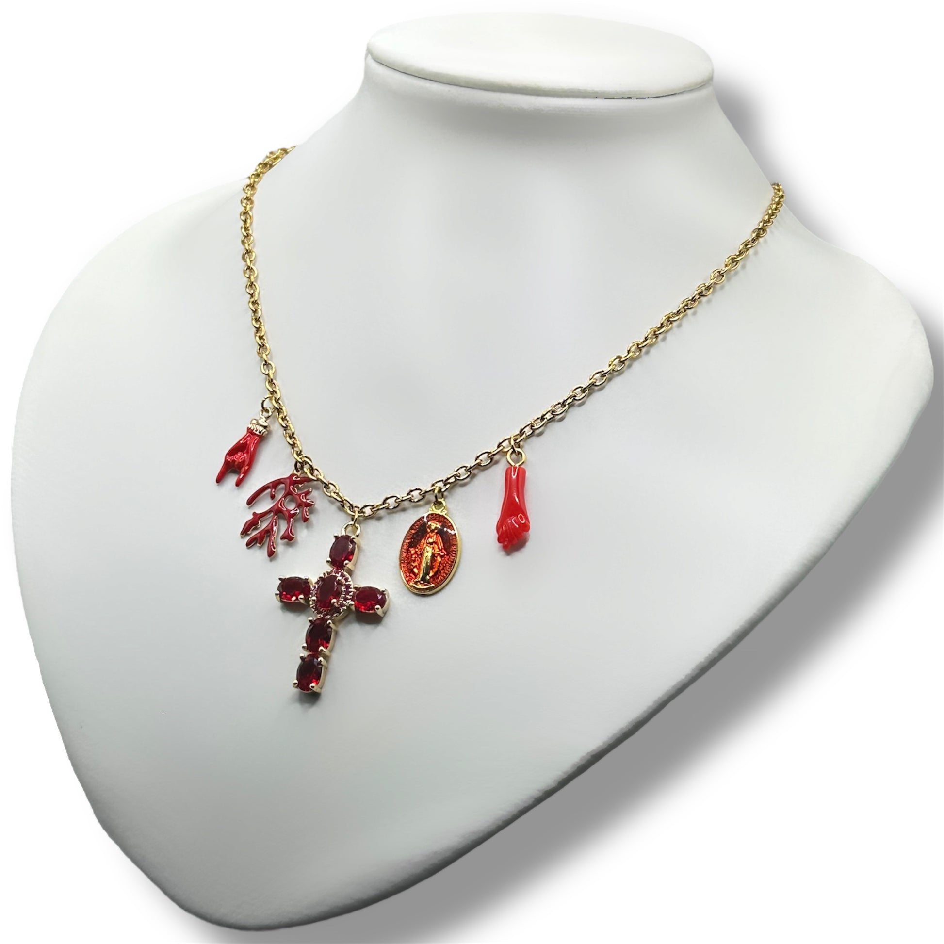 Le collier Ghjulia séduit par son équilibre entre finesse et caractère. Conçu en acier inoxydable doré, il est orné de 5 breloques soigneusement sélectionnées pour leur symbolique et leur éclat discret.
